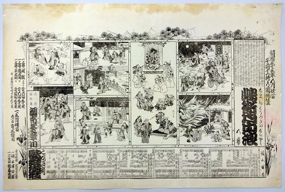 「芝居番付」とは、芝居の演目、配役、場面の挿絵などが描かれた、今で言う演劇のポスターやチラシのような印刷物です。単なる宣伝物という役割だけでなく、配役や挿絵などから、当時の興行の内容を知るための手がかりとして、大変重要な演劇資料です。