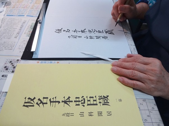 (台本カバーにタイトルを筆で書き入れる作業をしているところです)