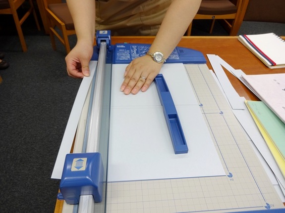 (支援者の方に頂いたカッターで、台本の大きさに合わせてカバーの紙をカット)
