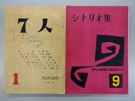 1956年1月発行の「7人」は、タイトルの通り、大島渚、高橋治、田村孟、吉田喜重など7人の助監督が集まって作られた同人誌です。この雑誌は2号で廃刊しますが、発展の形で「シナリオ集」が松竹助監督室より創刊されます。監督になる機会は助監督全員に開かれるべき、と考えた大島渚監督の考えが反映された雑誌で、表紙に「松竹大船撮影所監督助手会」と刷られています。この「シナリオ集」9号に掲載された大島渚監督のシナリオ『鳩を売る少年』が、『愛と希望の街』として劇映画デビュー作となりました。どちらも映画の歴史を今に伝える、珍しい資料です。