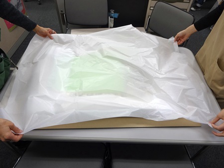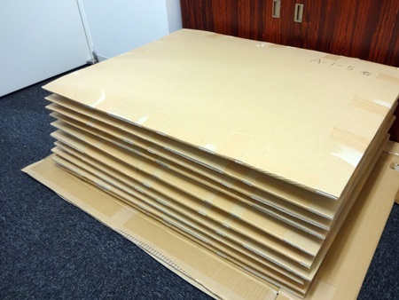 引出ごとに番付を運び出します。 段ボール板の上で番付を薄紙に包みます。