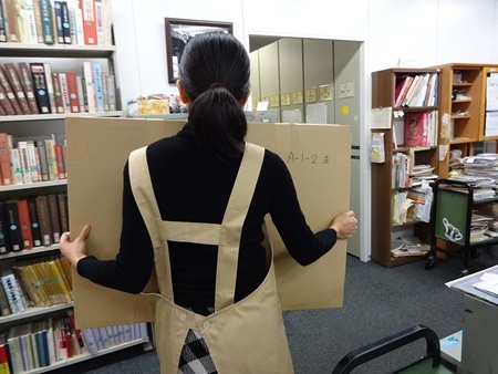 書庫の奥へ運びます。 今は腰の高さの山が2つ出来ています。