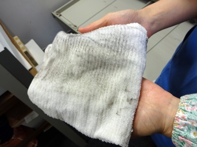 まず、濡れ雑巾で拭き、次に乾いた雑巾で拭きます。二人がかりで、一段ずつ、奥まで丁寧に拭きます。