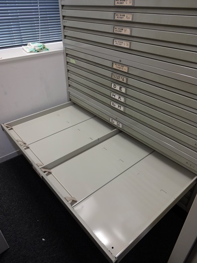 さて、今回のプロジェクトの「芝居番付」デジタル化ですが、新着情報でもお知らせした通り、「芝居番付」は昨年末、無事にアート・リサーチセンターに到着し、現在デジタル化作業を行っております。そのため当館の番付が入っていた引出しは空になっています。