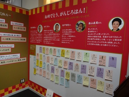 また、各界から当代に寄せられた応援メッセージがあり、その下のボードに、ご来場されたお客様も、当代のがんじろはん宛のメッセージを書いて、貼りつけられるようになっております。
