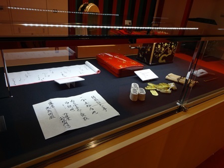 それぞれの愛用の品々、舞台写真を盛り込んだ新中村鴈治郎の年表などとともに、おなじみの『恋飛脚大和往来 封印切』で実際に使われる小判や証文などの小道具、衣裳…といったものもならんでいます。