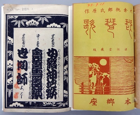 展示資料を一部ご紹介いたします。上の写真の資料は、どちらも明治43[1910]年のプログラムで、左より、5月新富座プログラム、9月本郷座プログラムです。