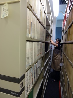(左)歌舞伎座の合本されたプログラムを右の書架から左の書架に移動しています