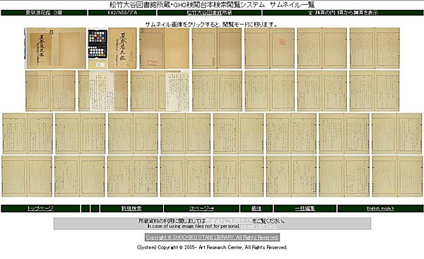 システムの開発及び公開は、松竹大谷図書館と立命館大学アート・リサーチセンターとの間で結ばれた協定に基づき、アート・リサーチセンターが行っています。当館HPトップページの【利用案内】「「貴重書」検索・閲覧サービス」にもリンクが貼られております。詳しい利用法についてはご利用ガイドをご覧ください。