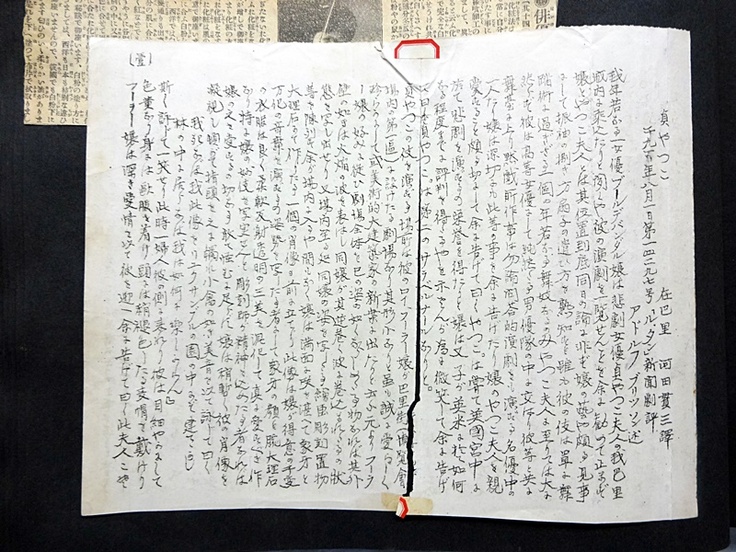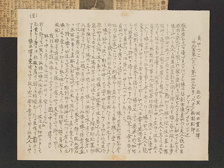 そのほか、音二郎・貞奴連名の、音二郎直筆の手紙や、音二郎がパリから支援者に送ったガリ版刷のマニフェスト「新演劇について」など、貴重な原物資料をご覧いただける数少ない機会ですので、皆様お誘い合わせの上、ぜひお運び下さいませ。