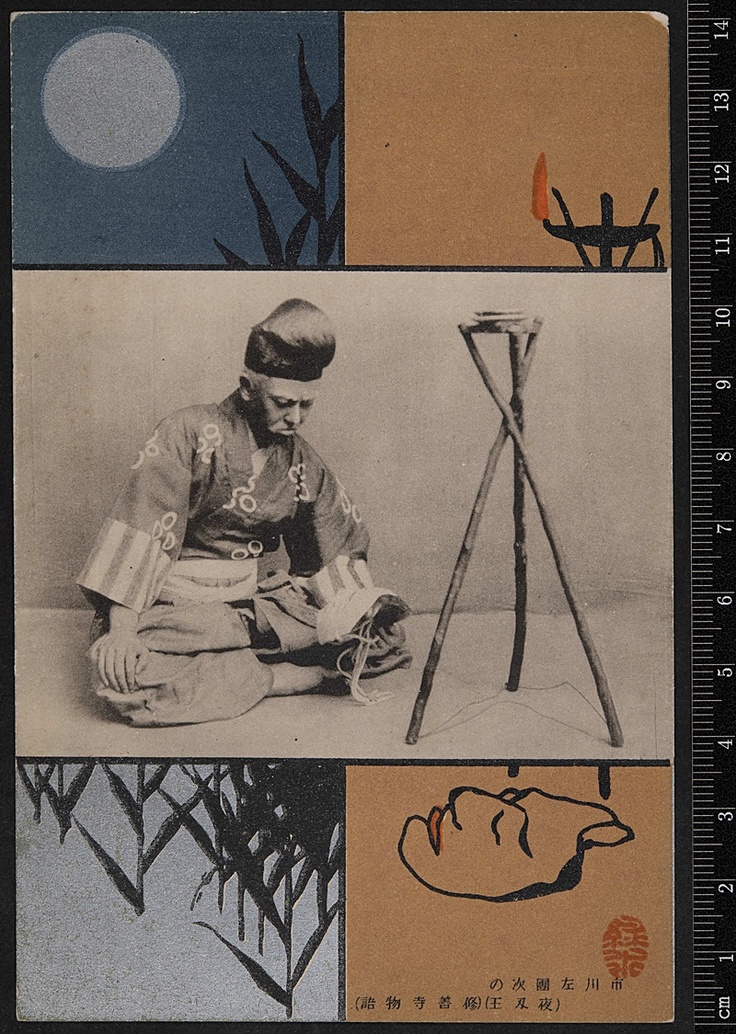 「名優當り藝絵葉書」は、明治44~45年頃、演芸画報社より俳優ごとの當り役を6種一組で発売された絵葉書です。発売された俳優は、十五世市村羽左衛門、六世尾上菊五郎、初世中村吉右衛門、二世市川左團次、六世尾上梅幸、八世市川高麗蔵(のちの七世松本幸四郎)など。