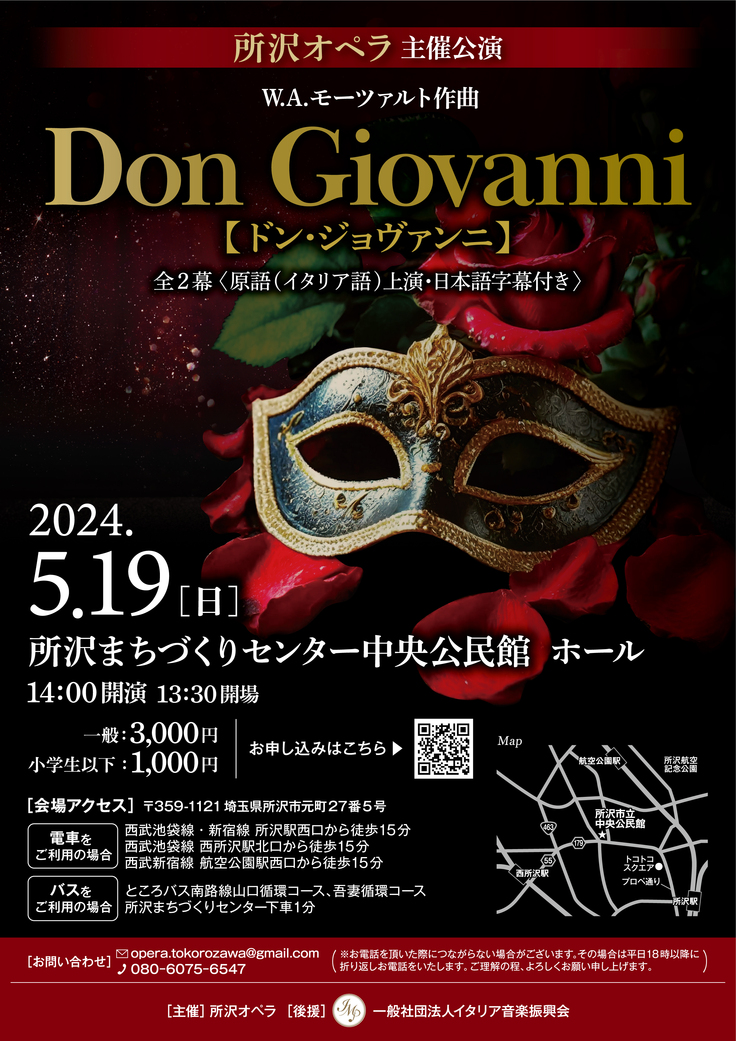 所沢オペラ主催公演、W.A.モーツァルト 作曲《ドン・ジョヴァンニ》5月19日公演にて、ホール費、人件費10万、衣裳費10万、舞台雑費10万に使用します。