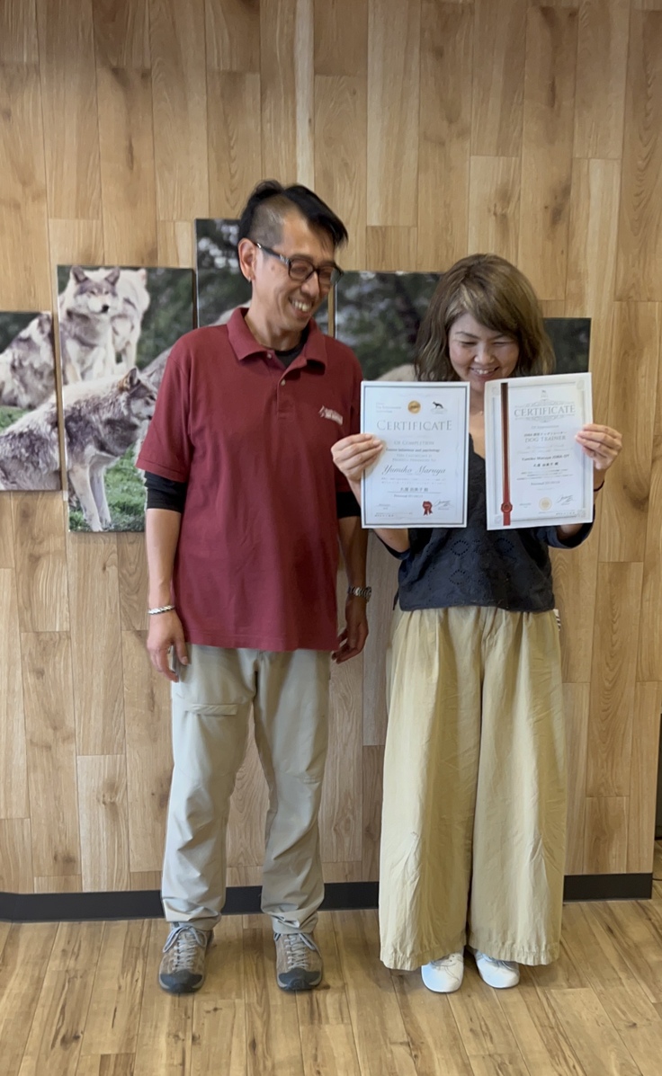 その時に、イヌとの関わり方で行動の違いがある事に気づき【動物行動学】【犬の心理学】【ドッグビヘイビアリスト】の存在を知り【動物福祉】に目を向けたイヌとの関わり方を知り、今年の夏に1年かけて日本ドッグビヘイビア協会ドッグトレーナーの認定を取得しました。