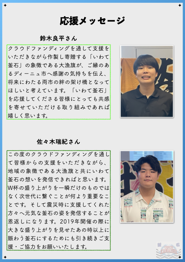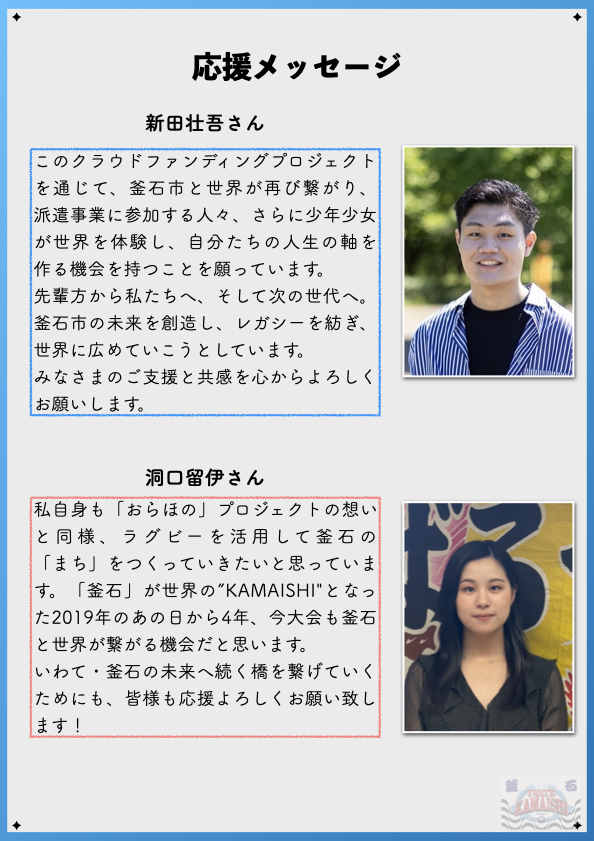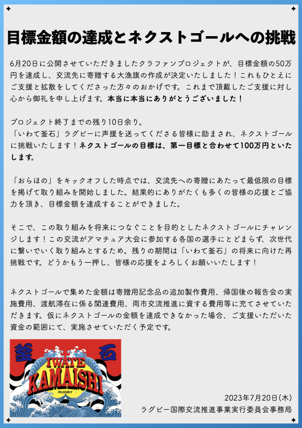 ラグビー国際交流推進事業実行委員会は、国際交流推進事業として岩手県民・釜石市民等による代表団を2023年9月20日から10月2日までディーニュ=レ=バン市等(フランス共和国)に派遣し、「第1回ワールドアマチュアラグビーフェスティバル」における各国との対戦やラグビー関連行事への参加を通して、国際交流の推進を行います。また、これらの事業を通して当県・当市における「まちづくり推進」を考えております。 上記目的推進のため、支援金は、本事業実施に係る寄贈用の「大漁旗」や対戦相手との交換に用いる「ペナント」等の作成費、本事業の報告会等の実施費等、渡航滞在に係る関連費用、姉妹都市との両市交流推進に資する費用に充てさせていただきます。