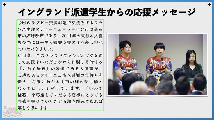【B】「いわて・釜石」感謝と友好のラグビー大漁旗を