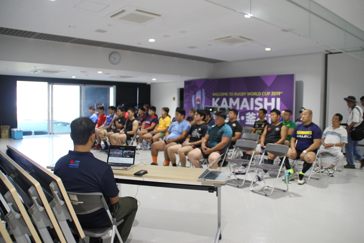 選手の皆様も遠方より参加をされ、基本の練習やポジションごとの確認、またゲーム形式での練習、また「東日本大震災の際の復興支援」、「ラグビーW杯2019年開催の意義」についてなどの事前研修を通してチームとしての一体感を深めました。