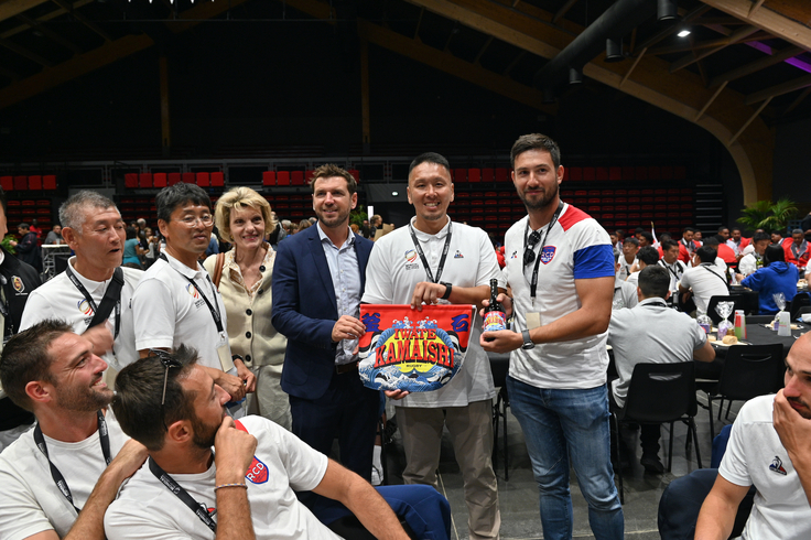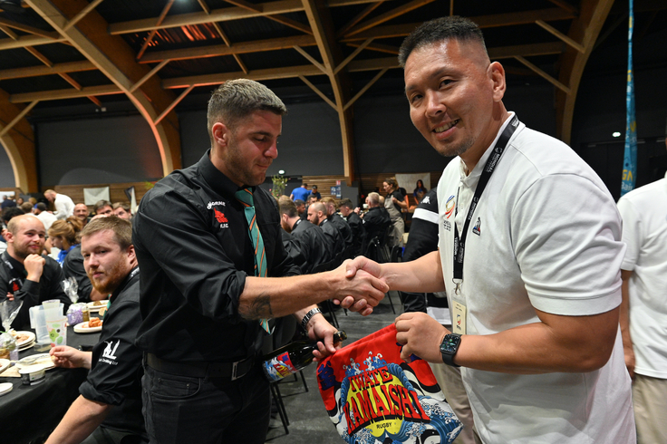 その大漁旗やペナントを、第1回ワールドアマチュアラグビーフェスティバルに参加した各国の代表チームや関係者に、我々の感謝と敬意を込めお渡ししてきました。