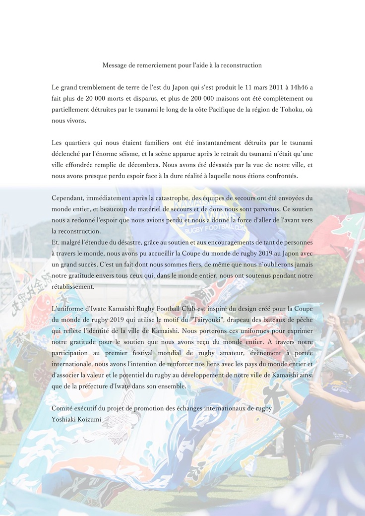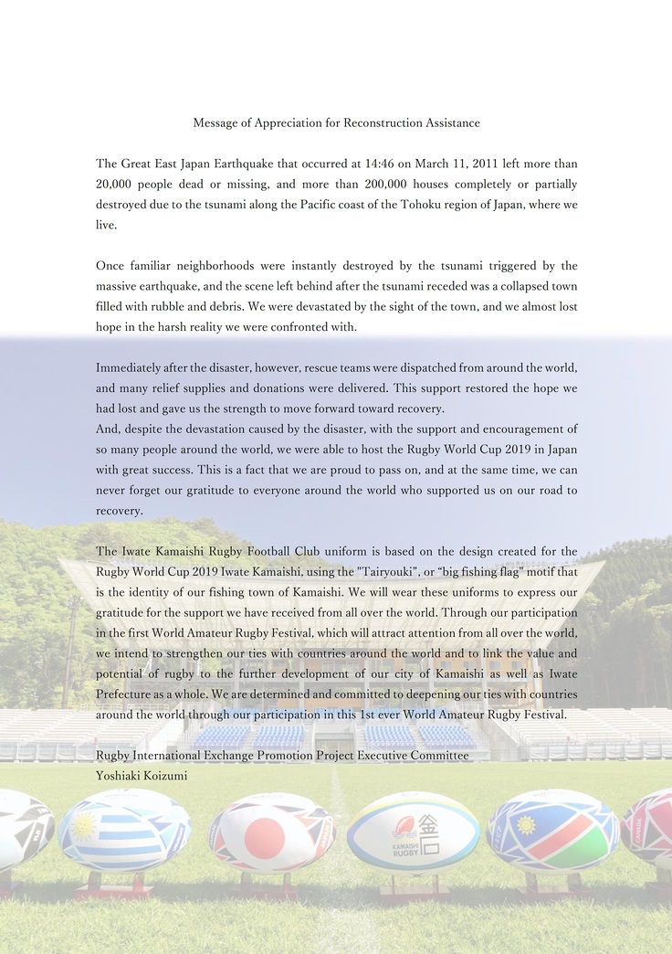 そして、世界中からの多くの支援に支えられ勇気づけられた我々は、震災で甚大なダメージを受けた町にも関わらず、ラグビーワールドカップ2019日本大会において試合を開催し、大きな成功を収めることができました。この事実は我々の受け継ぐべき誇りであり、それと同時に、復興への道のりを支えてくださった世界中の皆様への感謝を決して忘れることができません。