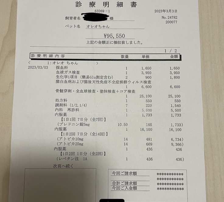 3月3日に輸血をお願いしていた病院から骨髄検査のために総合病に転院した為同じ日付で2枚あります。
