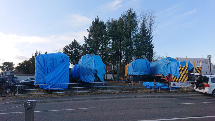 17日,計5名の方の協力を得て,修復中3両のシート掛けを実施しました.降雪前のまさにギリギリのタイミングで,その晩に降雪があり,翌朝,ブルーシートは雪化粧でした.