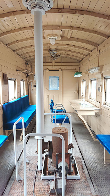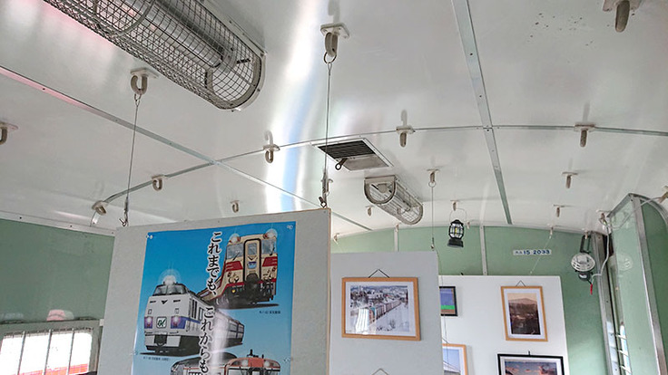 スユの特徴は郵便護送車ということで、天井全面にフックが取り付けられていることです。この特徴を利用して展示パネルはこのフックから釣りました。