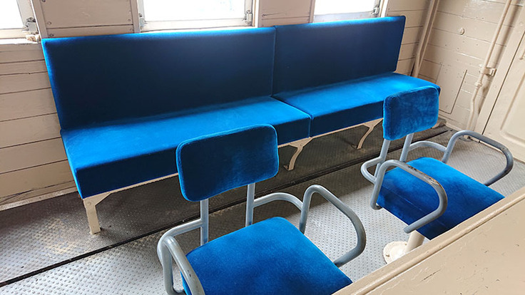 修復された車両の内部、鉄道文字再現、支援銘板はこうなりました。