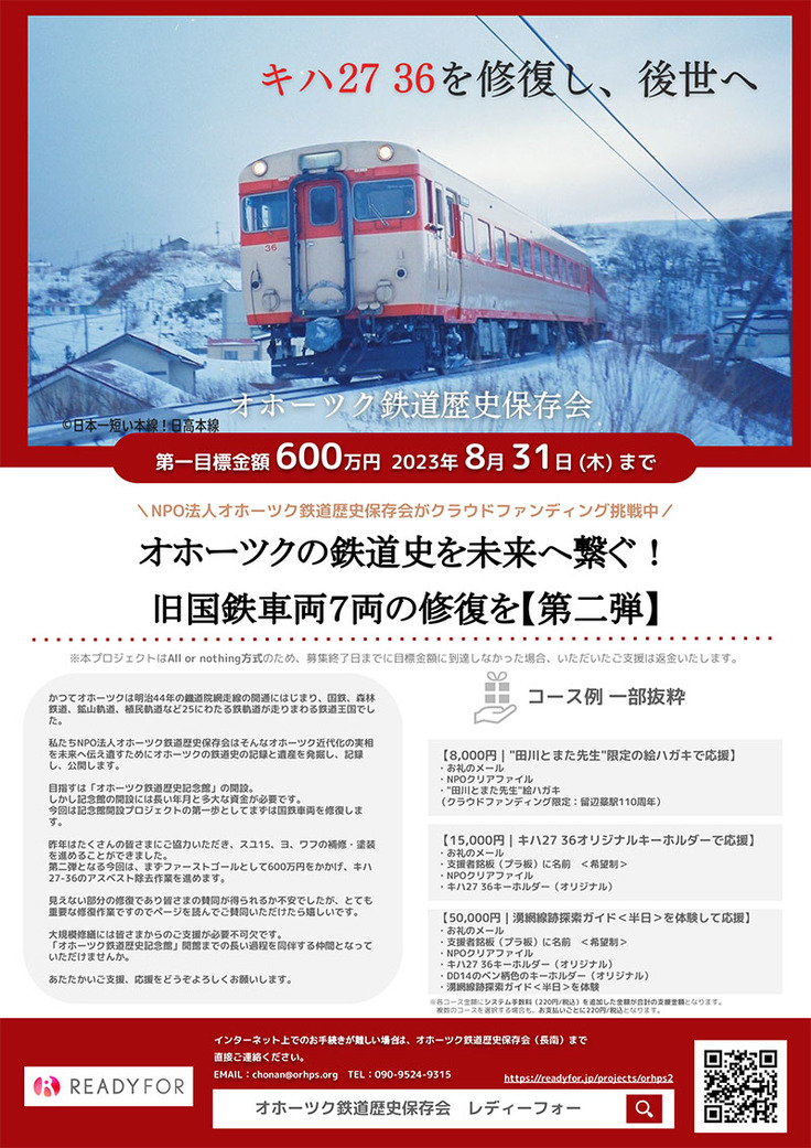 現在はこれに引続き、キハ27 36の修復をめざし目標額600万円のクラウドファンディングに挑戦しておりますが、現状、極めて苦戦をしております。