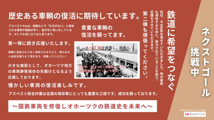 7月5日からスタートしたクラウドファンディング『オホーツクの鉄道史を未来へ繋ぐ!旧国鉄車両7両の修復を【第二弾】』プロジェクトもラストスパート!!!