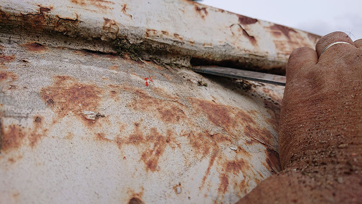 雨どいの外側です。パテが劣化しています。ここはスクレーパーで綺麗に除去して、キッチリと防錆対策を施す必要があります。長い間にはここの腐食が命取りになりかねませんから。