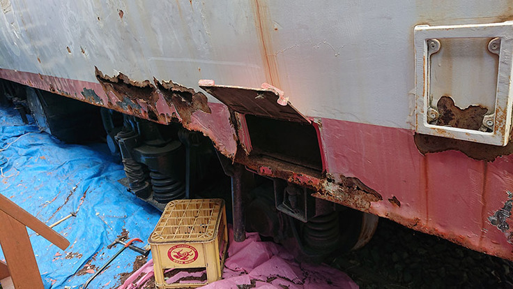 9月20日、25日には足場組みとボディー下部の板金がはじまるので、腐食部、穴あき部の錆落としを行いました。この後防錆処理をして、板金業者の作業に進んでもらいます。