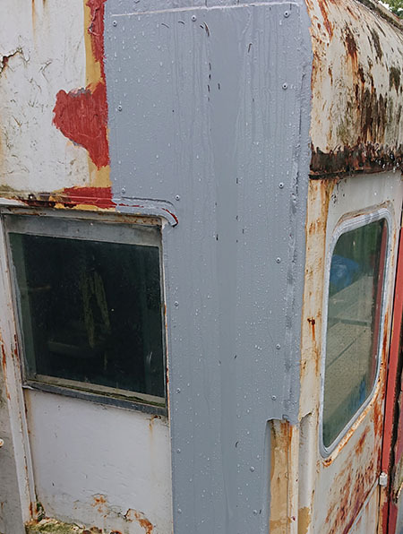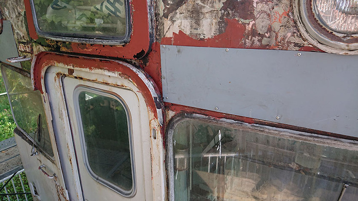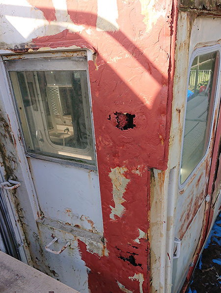 車体下部の腐食は完全な穴あき状態で、パテ埋めでは追い付かず板金、しかも溶接が難しくリベット打ちになります。