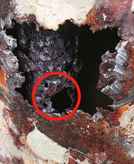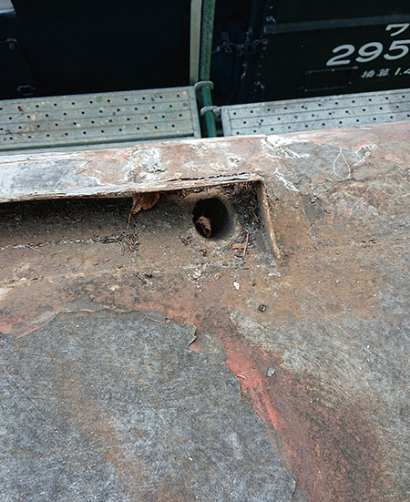 腐食穴あきの原因の一つがこれでした!屋根の雨どいからの排水パイプに穴が開いていました。ここから車体内部に雨が侵入しています。