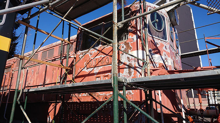 キハ27のアスベスト除去作業の間はDD14の錆落とし・塗装はがしを進めております。今日はその様子をご報告いたします。