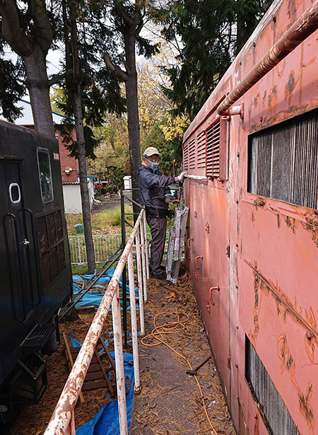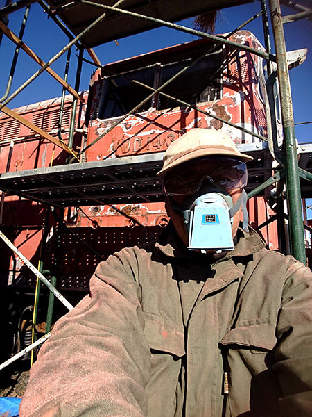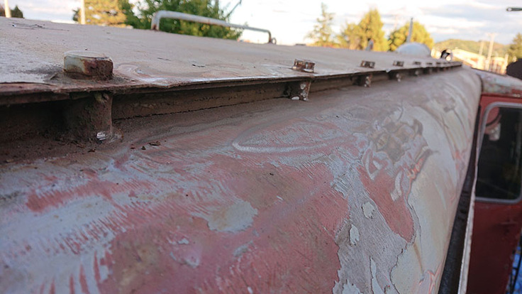 今日時点での剥がしの状況です。塗装の劣化自体はキハ27よりは状態は良いです。気動車と機関車の違いもあり、鉄はかなり良いものを使っていることが判ります。しかし、手すりや桟、ステップ、換気口等細かな部分が多く、グラインダーの向きを変えたり、それでも届かない部分が多く剥がし作業は手間がかかります。