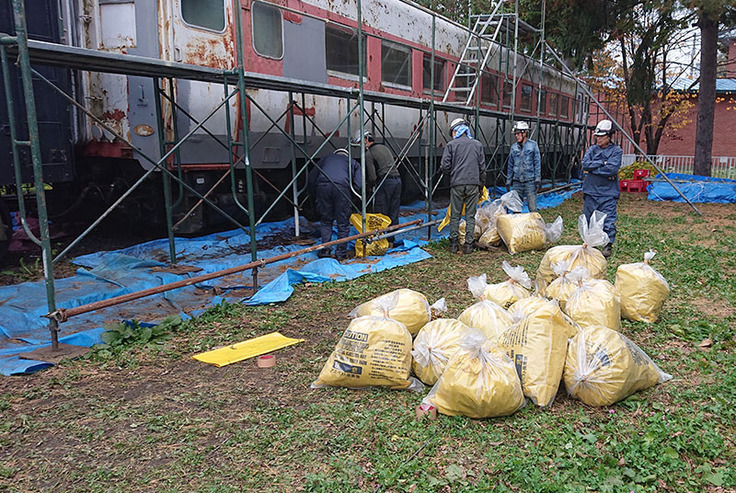 10月16日から開始したキハ27のアスベスト除去作業が28日に終了しました。ほぼ2週間にわたる過酷な作業!本当にご苦労様でした。
