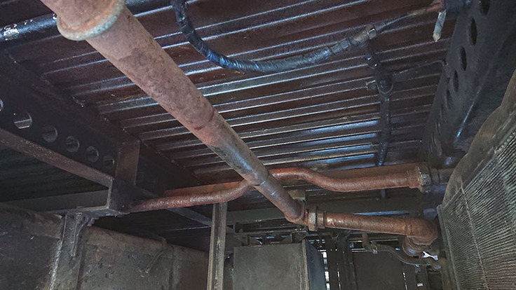 アンダーシールも水管の巻物もきれいに取り除かれています。連日エアーガンの大騒音と中腰での作業を行っていただいた成果です。