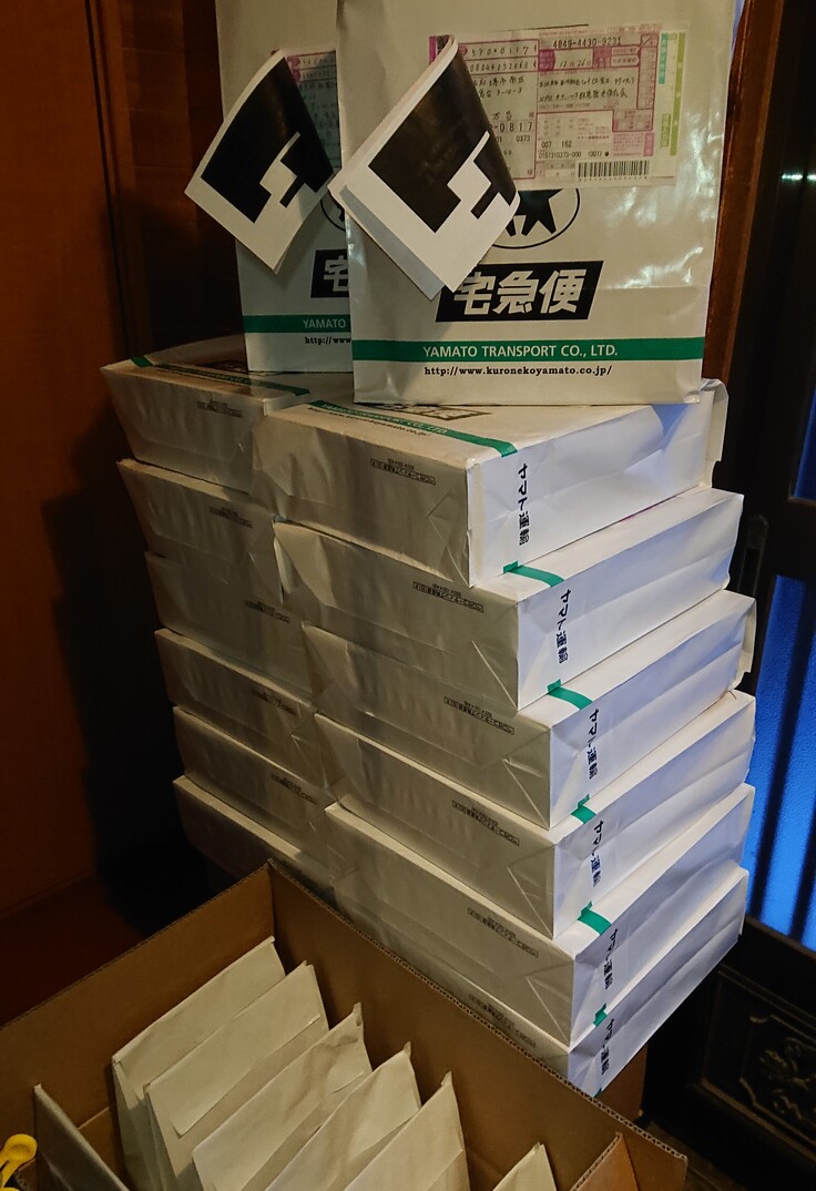 大変申し訳ございませんでした。暫時発送を進めてきまして、昨日大部分の発送を終えることができました。一日二日のうちには皆さんの所にお届けになると思います。(一部代理支援の方や、極々身近な方にはもう少々お時間をいただく方がおりますが。)