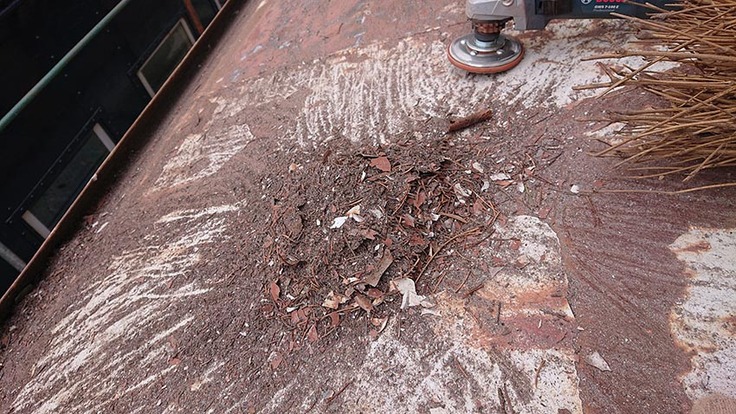 剝がされた塗装と錆。サンダーとは違って粉塵にはならないので近所への迷惑は軽減されます。