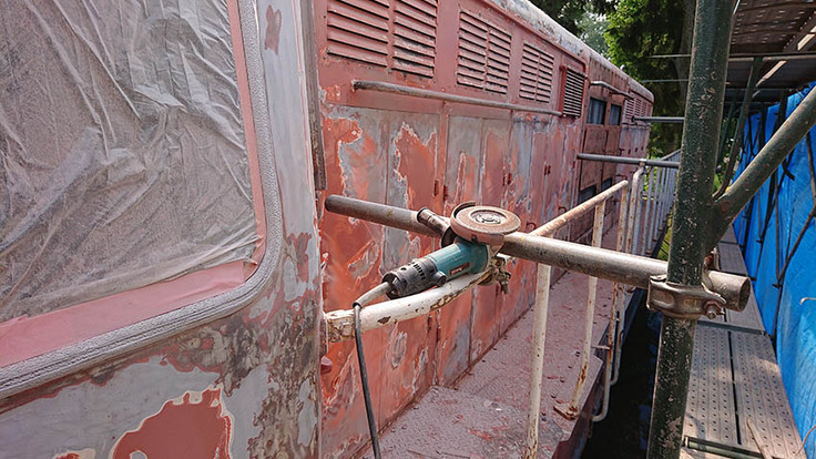 まだ、DD14の剥がし作業が残っています。こちらも急ピッチ、猛暑の中、終日作業です。グラインダーの振動で握力がなくなります。