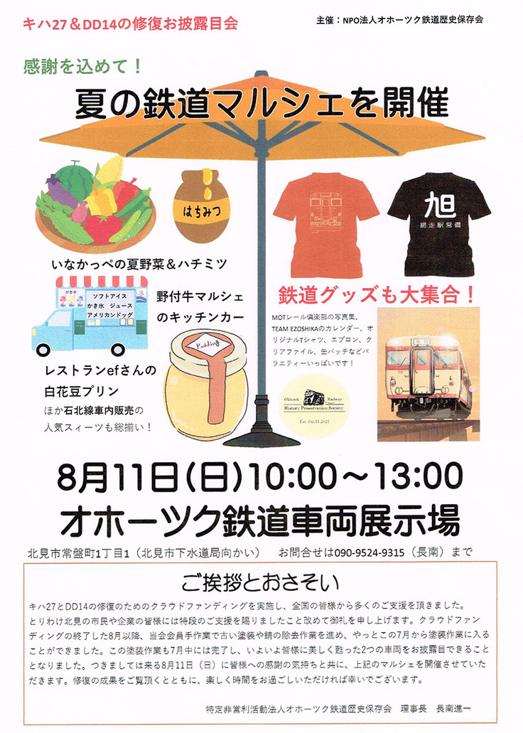 昨年の9月からはじめた修復作業。12月から3月までの冬ごもりを除いて、ほぼ6ケ月の錆落としと塗装はがしの後、7月15日から開始した塗装作業も終盤にかかりました。8月11日に皆様への感謝の気持ちも込めて、お披露目会と鉄道マルシェを開催いたします。