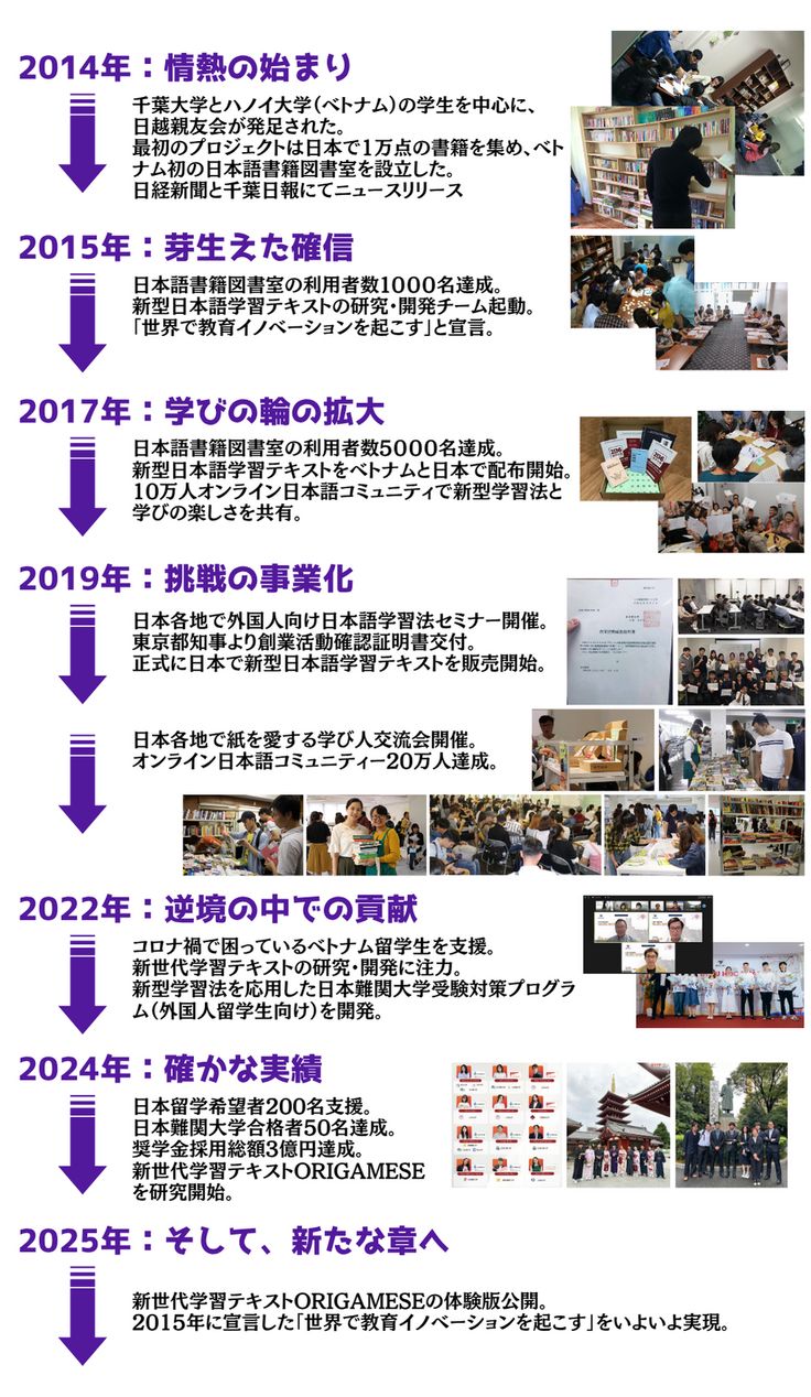 ・適切に寄贈先を決定出来る理由:既に学びの意欲がある子供たちが集う教室と提携することで、ORIGAMESEを確実に届けることができます。さらに、教育のプロである先生方を通じて、その使い方や楽しさを直接指導していただくことで、教材の効果を最大限に高め、一過性のイベントではない、持続的な学びの機会を創出します。 この提携戦略を確実に実行できる背景には、私たち「日越親友会」が10年間培ってきた教育現場での実績があります。ベトナムでの図書室設立から、国内外での学習コミュニティ運営(20万人規模)、学習塾の開校に至るまで、私たちは常に教育機関やNPOと直接向き合い、信頼関係を築いてきました。