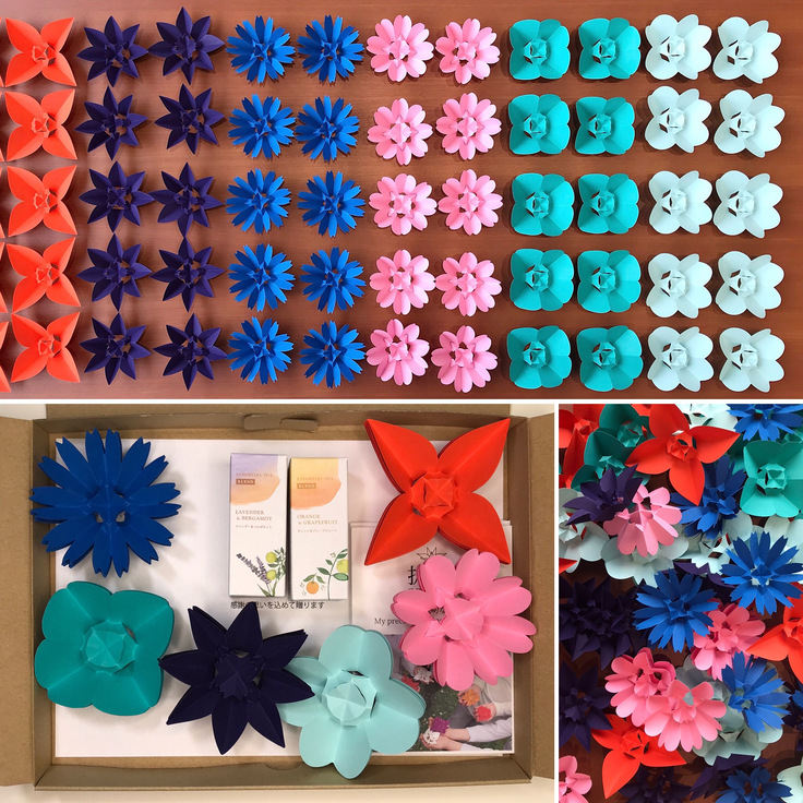 実際には5万個の折花(おりはな)とアロマオイル2500本を既に用意していていて、60個の折花とアロマオイル2本(アロマオイルは生活の木から購入)を1セットにしてクリックポストで無料で発送させていただいています。(最大1施設に6箱まで)