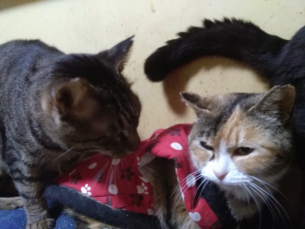 お外の子とは思えないほど、フアフアのわたあめのような三毛さんです。皆、興味津々です。