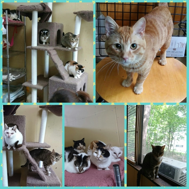キャットタワーにいる3匹は子猫の時に保護した兄弟ですが、おもちゃで遊んでもらうのが大好きです!茶トラの小久保くんは殺処分寸前に保護したのですが、抱っこして~とスリスリ甘えてきます。左下の写真のシャム系のミクロは乳飲み子で保護し授乳して育てた子猫ですが今も目や鼻のグズグズは治りません。でもとにかく人懐こくて甘えん坊です。