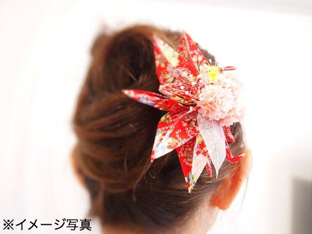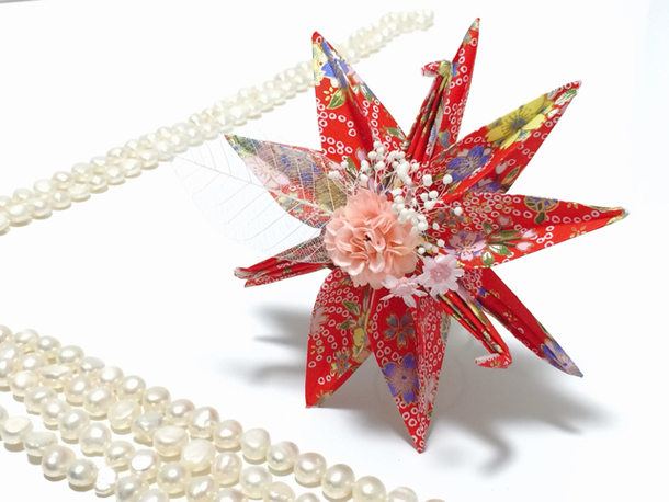友禅和紙で折った華鶴三羽に、シルクフラワー・ドライフラワー