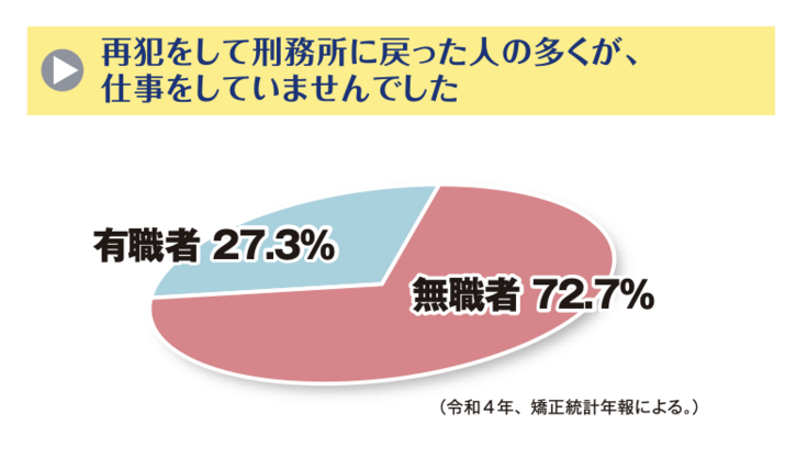 また、再犯を犯し、刑務所に再入所する者の約7割は無職であるというデータが示すように、再犯率の高さには、出所後の「居場所のなさ」や「金銭面の困窮」が関係しています。