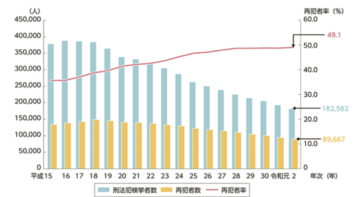 近年、犯罪を犯し検挙される人数は減少傾向にありますが、再び犯罪を犯す「再犯者率」は増加傾向にあり、令和2年には49.1%となりました。