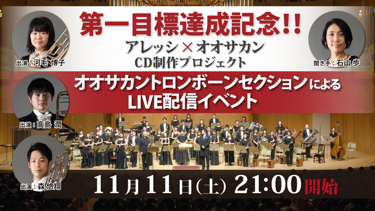 また、第一目標達成を記念して、11月11日には、オオサカントロンボーンセクションによるLIVE配信イベントを実施を決定いたしました。