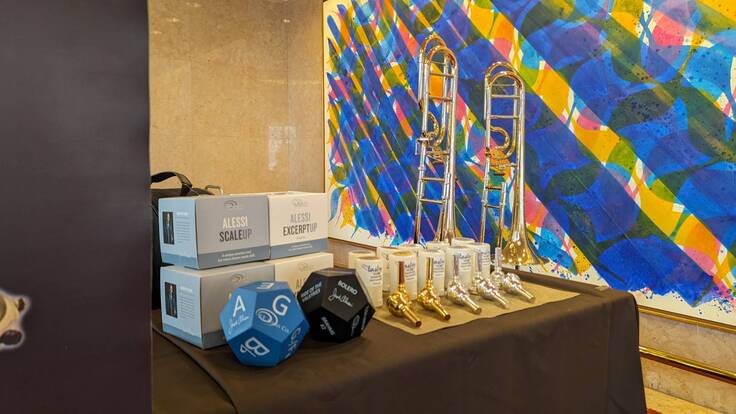 ホールロビーには、S.E.Shiresのアレッシモデル・トロンボーンやLaskeyのマウスピースの試奏ブースが設置されました。さらにはアレッシ氏考案のプラクティスキューブまで!実際に手に取ってご覧いただくことができました。