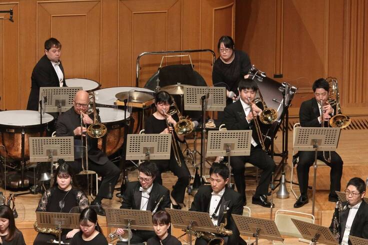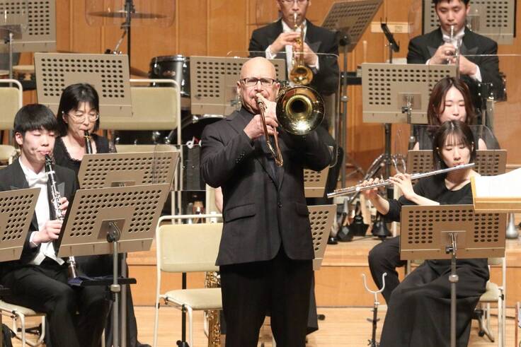 第二部では『ジョーのタンゴ』を披露。この曲は氏のために作られた作品であり、吹奏楽版はこの日が初演となりました。タンゴらしいキレのあるリズムに乗って、とても細やかな装飾やスライドさばきとともに、氏の歌が心地よく奏でられました。